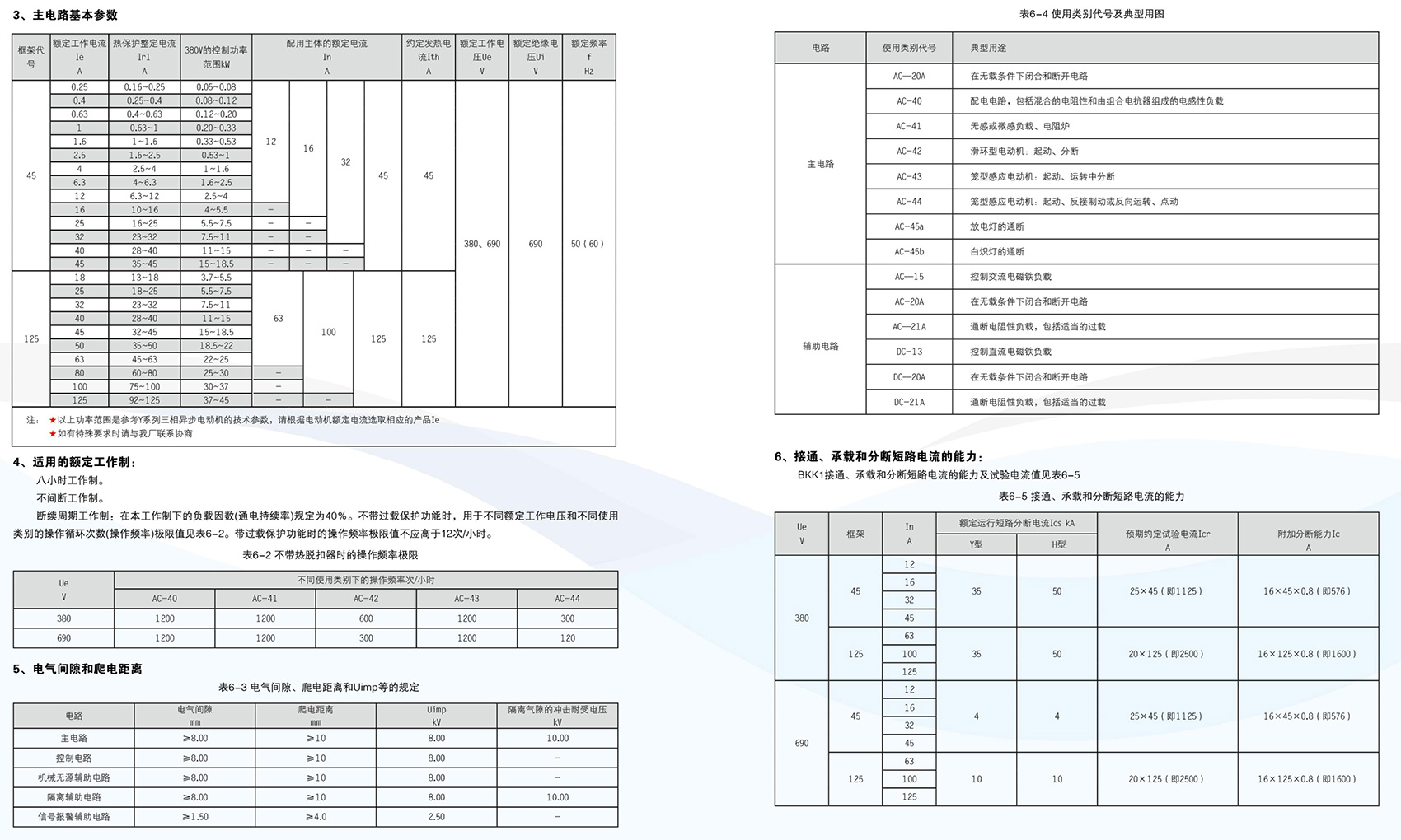 BKK1系列控制与保护开关电器主要用于交流50Hz(60Hz)、额定电压至690V、额定工作电流自0.4A至125A的电力系统中接通、承载和分断正常条件(包括规定的过载条件)下的电流,且能够接通、承载并分断规定的非正常条件(如短路)下的电流。BKK1系列采用模块化的单一产品结构形式,集成了传统的断路器(熔断器)、接触器、过载(或过流、断相)保护继电器、起动器、隔离器、电机综合保护器等多种传统的分离元器件。产品具有远距离自动控制与就地人力控制兼有的方式进行控制操作的功能,具有协调配合的时间-电流保护特性,具有控制与保护自配合、短路后连续运行,具有分断能力高,飞弧距离小、寿命长,具有保护整定电流均可调的特性,操作方便、配套模块多样齐全等优点,可以实现对电动机负载、配电负载的控制和保护。产品符合GB/T 14048.9《控制与保护开关电器》标准。